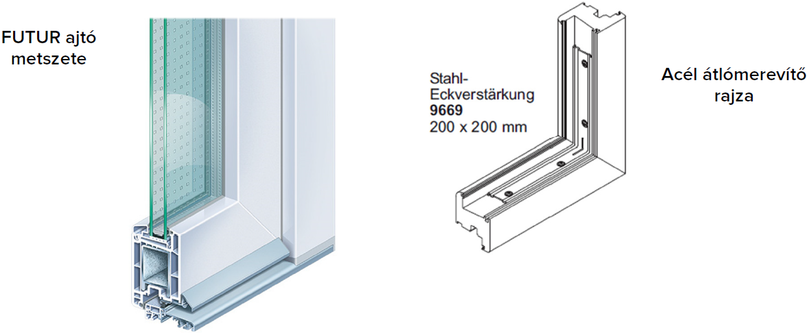 Szárnysarok merevítő: a FUTUR bejárati ajtók szárnyának mind a 4 sarkába beszereltünk, sarkonként 1 pár, hegeszthető pvc sarokmerevítőt, melyek biztosítják a szárnyak acélmerevítőinek körkörös, statikai összekapcsolódását, mely nexus rendkívüli szárnystatikát eredményez.