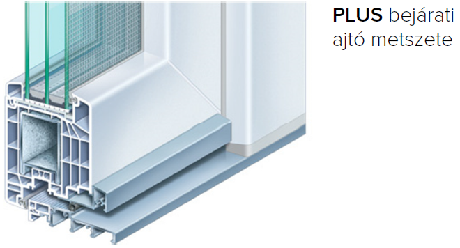 A PLUS bejárati ajtók széles ajtószárnyból, szélesített ajtótokból, hőhídmentes aluküszöbbel, küszöbzáró dupla gumitömítéssel, és 3 db, extra teherbírású ajtópánttal készülnek.